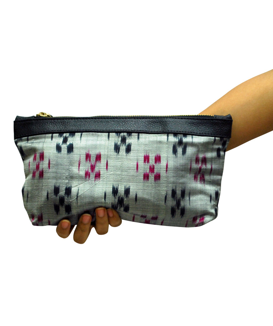 Material: Ikat silk saree, leather edge, cotton lining and metal zipper