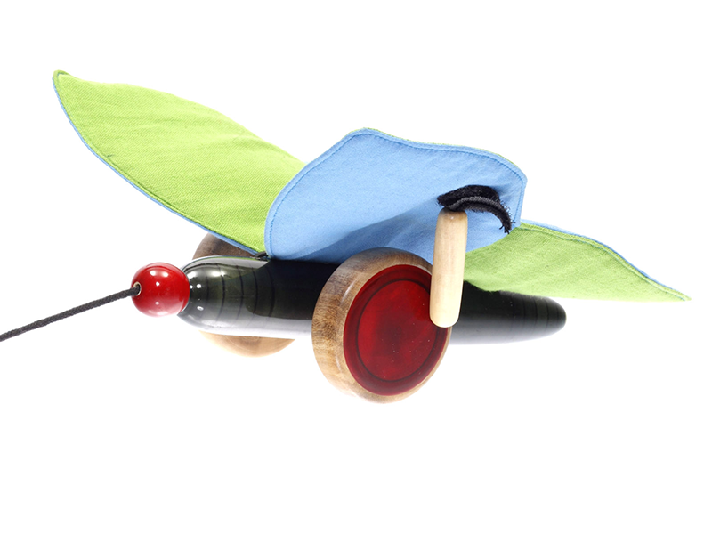 Thithli Pull Toy is a simple pull toy. Pull it along and watch it happily flap its wings. This toy is made using traditional lacware toy making techniques and has fabric wings. Natural dyes are used to colour the wooden body and the fabric wings are dyed with non-toxic colours.