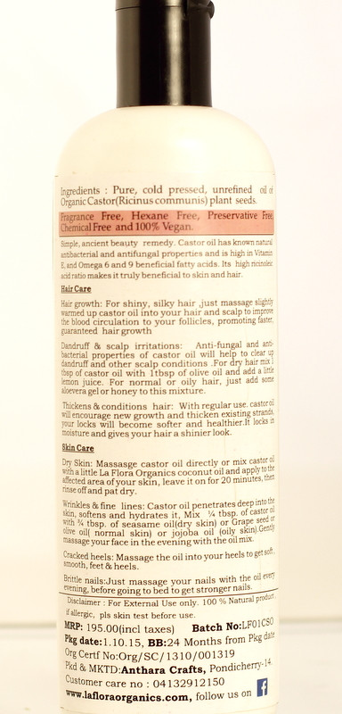 Direction of Use/Dosage For Hair Care : For shiny, silky hair , just massage slightly warmed up castor oil into your hair and scalp to improve the blood circulation to your follicles, promoting faster, guaranteed hair growth. Dandruff & scalp irritations: Anti-fungal and anti-bacterial properties of castor oil will help to clear up dandruff and other scalp conditions .For dry hair mix 1 tablespoon of castor oil with 1 tablespoon of olive oil and add juice of half a lemon. Or else just add some aloe-vera gel or honey to this mixture. Thickens & conditions hair: With regular use, castor oil will encourage new growth and thicken existing strands, your locks will become softer and healthier. It locks in moisture and gives your hair a shinier look. Split ends: Apply castor oil on the ends of your hair for half an hour before shampooing to get rid of dry, split ends. Thicker eyebrows and longer eyelashes: Apply a little castor oil on your eye lashes and eyebrows before going to bed to get naturally long eyelashes & thicker eyebrows with regular use. For Skin Care: Dry Skin: Massage castor oil directly or mix castor oil with a little La Flora Organics coconut oil and apply to the affected area of your skin, leave it on for 20 minutes, then rinse off and pat dry. Wrinkles & fine lines: Castor oil penetrates deep into the skin, softens and hydrates it, promote the production of elastin and collagen, which helps to delay the appearance of fine lines and wrinkles and give the skin a more youthful appearance. Mix ¼ tbsp. of castor oil with ¾ tbsp. of sesame oil (dry skin) or Grape seed or olive oil ( normal skin) or jojoba oil (oily skin).Gently massage your face in the evening with the oil mix, then put slightly warm damp washcloth on your face for about a minute and take away the excess oil with a cotton pad. Your skin will be soft, nourished and hydrated. Cracked heels: Massage the oil into your heels to get soft and smooth feet & heels. Stretch marks: As part of your prenatal skincare regime massage the oil into your skin, twice a day as it will help prevent the stretch marks from forming. You can also use it after birth to help the marks heal. Brittle nails: Just massage your nails with the oil every evening, before going to bed to get stronger nails.