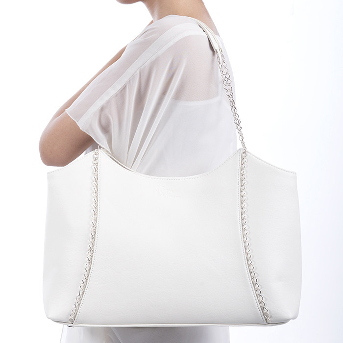 Elegant tote with cotton lining in one of the 7 chakras colors. The infinity chain is a reminder of the small importance of time and the universal union each individual has with the global humanity.Comes with infinity chain, k logo on zip. It includes key holder, phone pocket, pocket with zip.