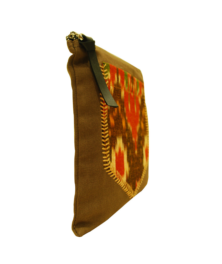 Upcycled Ikat Back Pocket: Indiegenius is a range of textile based accessories made from recycled, upcycled material and using traditional Indian craft techniques. Watch as rich and vibrant Ikkat fabrics with contemporary, stylish cuts. Indiegenius by Clean Planet brings to you a contemporary multi-functional back pocket pouch with kantha work. It is crafted from Canvas cotton. Accessorize your ensemble with this traditional contemporary piece.
